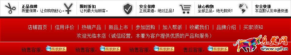 <table align="center" border="0" width="950" cellpadding="0" cellspacing="0"> <tbody> <tr> <td background="http://img03.taobaocdn.com/imgextra/i3/T2fjRLXjhbXXXXXXXX-719776838.gif" height="54" valign="top"> <table style="font-size:12px;" align="left" border="0" width="950" cellpadding="0" cellspacing="0"> <tbody> <tr> <td height="42" width="71"> </td> <td align="left" valign="bottom" width="190"> <span style="color:rgb(0,0,0);"><strong>正品保障</strong><br /> 質(zhì)量保障,讓你購物舒心。</span> </td> <td align="left" valign="bottom" width="194"> <span style="color:rgb(0,0,0);"><strong>限時折扣</strong><br /> 讓利最大給顧客。</span> </td> <td align="left" valign="bottom" width="191"> <span style="color:rgb(0,0,0);"><strong>安全保障</strong><br /> 正規(guī)渠道,絕對正品!</span> </td> <td align="left" valign="bottom" width="187"> <span style="color:rgb(0,0,0);"><strong>放心購物</strong><br /> 全部正品,絕無假貨!</span> </td> <td align="left" valign="bottom" width="117"> <span style="color:rgb(0,0,0);"><strong>安全快捷</strong><br /> 本店默認(rèn)發(fā)申通快遞</span> </td> </tr> </tbody> </table> </td> </tr> </tbody> </table> <table style="color:#FFFFFF;font-size:12px;" align="center" border="0" height="127" width="950" cellpadding="0" cellspacing="0"> <tbody> <tr> <td background="http://img03.taobaocdn.com/imgextra/i3/T2SjNLXk4bXXXXXXXX-719776838.gif" height="127" valign="top"> <table border="0" width="950" cellpadding="0" cellspacing="0"> <tbody> <tr> <td colspan="6" align="center" height="44" valign="bottom"> <span style="color:rgb(255,255,255);">店鋪首頁 | 信用評價 | 熱銷產(chǎn)品 | 新品上市 | 參加團(tuán)購 | 加入幫派 | 收藏我們 | 品牌介紹 | 買家須知 </span> </td> </tr> <tr> <td colspan="6" align="center" height="28" valign="bottom"> <span style="color:rgb(255,255,255);">歡迎光臨本店(誠信經(jīng)營,本著為客戶提供優(yōu)質(zhì)的產(chǎn)品和服務(wù)) </span> </td> </tr> <tr> <td colspan="6" height="16" valign="center"> </td> </tr> <tr> <td height="32" valign="center" width="70"> </td> <td data-attr-replace="[{"type":"innerHTML","desc":"這里輸入第一個旺旺代碼"}]" align="left" valign="center" width="176"> 銷售客服:<img src="http://img02.taobaocdn.com/tps/i2/T1.4FJXdxIXXXXXXXX-68-21.gif" data-cke-saved-src="http://img02.taobaocdn.com/tps/i2/T1.4FJXdxIXXXXXXXX-68-21.gif" /> </td> <td data-attr-replace="[{"type":"innerHTML","desc":"這里輸入第二個旺旺代碼"}]" align="left" valign="center" width="176"> 銷售客服:<img src="http://img02.taobaocdn.com/tps/i2/T1.4FJXdxIXXXXXXXX-68-21.gif" data-cke-saved-src="http://img02.taobaocdn.com/tps/i2/T1.4FJXdxIXXXXXXXX-68-21.gif" /> </td> <td data-attr-replace="[{"type":"innerHTML","desc":"這里輸入第三個旺旺代碼"}]" align="left" valign="center" width="176"> 銷售客服:<img src="http://img02.taobaocdn.com/tps/i2/T1.4FJXdxIXXXXXXXX-68-21.gif" data-cke-saved-src="http://img02.taobaocdn.com/tps/i2/T1.4FJXdxIXXXXXXXX-68-21.gif" /> </td> <td data-attr-replace="[{"type":"innerHTML","desc":"這里輸入第四個旺旺代碼"}]" align="left" valign="center" width="176"> 售后客服:<img src="http://img02.taobaocdn.com/tps/i2/T1.4FJXdxIXXXXXXXX-68-21.gif" data-cke-saved-src="http://img02.taobaocdn.com/tps/i2/T1.4FJXdxIXXXXXXXX-68-21.gif" /> </td> <td data-attr-replace="[{"type":"innerHTML","desc":"這里輸入第五個旺旺代碼"}]" align="left" valign="center" width="176"> 投訴建議:<img src="http://img02.taobaocdn.com/tps/i2/T1.4FJXdxIXXXXXXXX-68-21.gif" data-cke-saved-src="http://img02.taobaocdn.com/tps/i2/T1.4FJXdxIXXXXXXXX-68-21.gif" /> </td> </tr> </tbody> </table> </td> </tr> </tbody> </table>