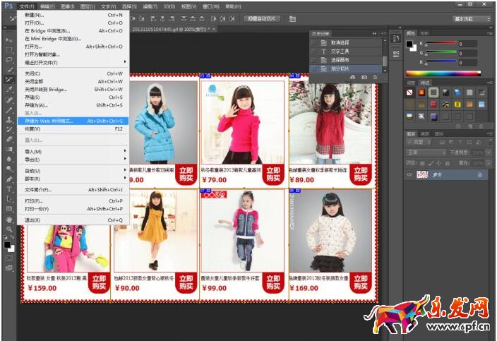 圖片切好后,我們要對切好的素材進行保存,這里不是簡單的把文件存儲或者存儲為XXX哦,我們要用文件存儲為Web和設備所用格式 (或者按快捷鍵ctrl+alt+shift+S)。