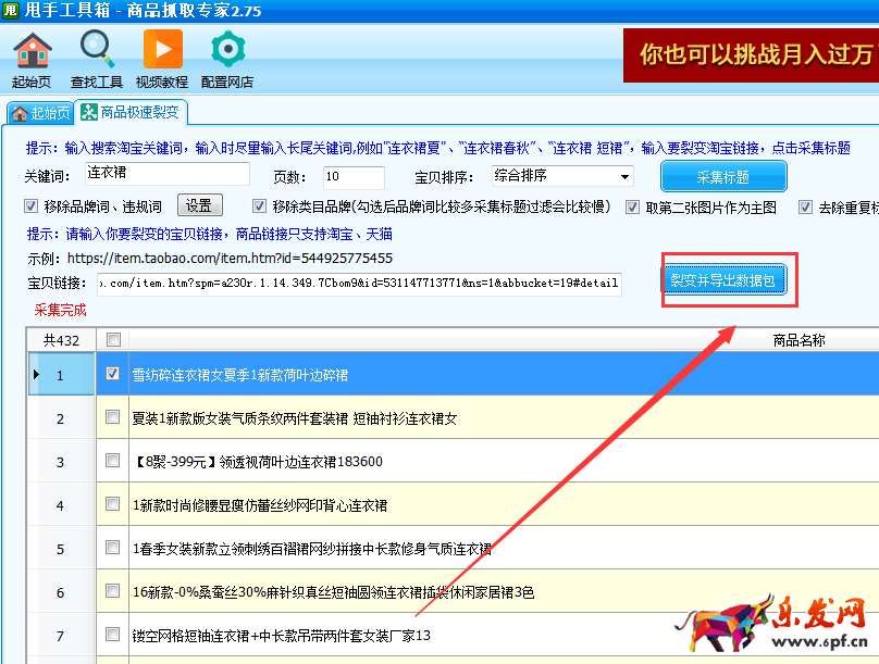 7.商品下載完成后,點(diǎn)擊裂變并導(dǎo)出數(shù)據(jù)包到指定文件夾,接下來用淘寶助理上傳即可。
