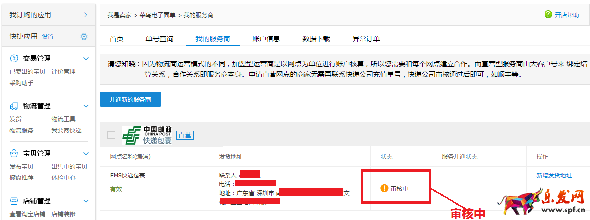 顯示“審核中”表示申請已提交,一般提交后盡快告知快遞公司您申請開通電子面單服務(wù)的旺旺名,讓快遞公司給審核,審核人員會問您用什么軟件打印快遞單,您可以回答說是:“易掌柜”打單軟件。