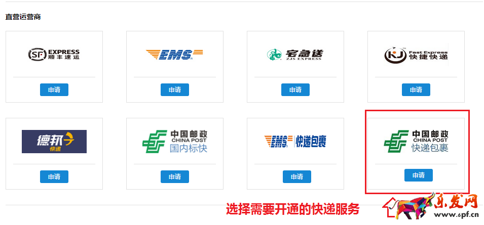 選擇需要開通的快遞服務(wù)商,這里分為加盟運(yùn)營商和直營運(yùn)營商,可以根據(jù)自身情況去選擇開通,如果已經(jīng)開通電子面單的可以直接跳過此步。這里以選擇開通中國郵政為例,找到中國郵政圖標(biāo),點(diǎn)擊申請: