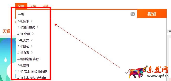 還有第二個免費的選詞方法,第一步直接在搜索框搜斗柜,淘寶下拉框會有這個詞的相關搜索詞,只要是下拉框推薦的就是有人搜索過有數據的詞,尋找二級詞,首先推薦的是斗柜實木這個二級詞,我們就先來搜索斗柜實木。