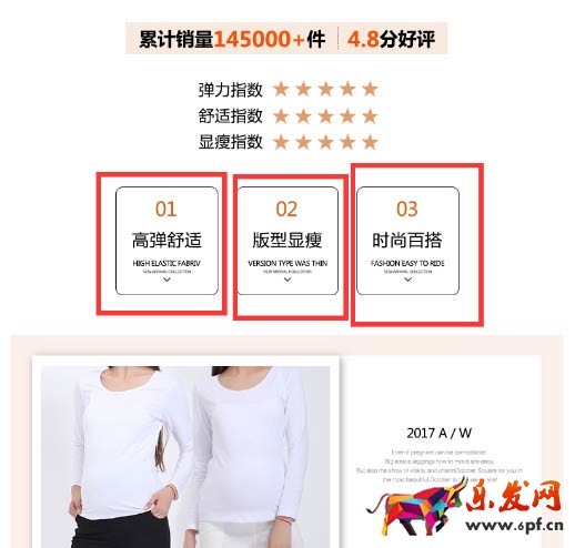 繼續看剛才孕婦褲的詳情頁中部,重點塑造了三個賣點,1、高彈舒適、2版型顯瘦,3、時尚百搭。從三個方面入手,深挖了寶貝的賣點。繼續向賣家深化說:穿我這款寶貝,不僅舒適,而且很美的。