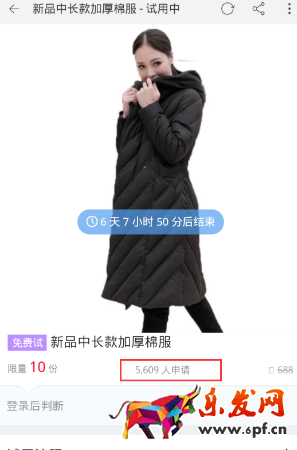 試用中心全面無線化,買家申請試用僅支持手機申請。商家信譽等級要求為≥1鉆。報名地址為:shishi.taobao.com;下面是某個衣服的的免費試用界面,5609人申請了該產品,流量很大!