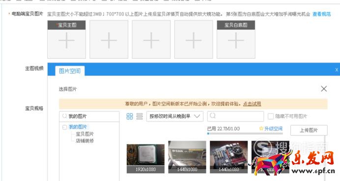 然后是填“電腦端寶貝圖片”,點一下“寶貝主圖”,會彈出你的“圖片空間”,如果空間里有此寶貝的圖片,就直接點擊,圖片就會添加在主圖里。空間里沒有的話就點旁邊的“上傳圖片”,把你在本地的圖片直接拖到界面的“上傳”小框內就可以添加了