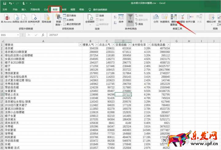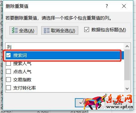 用excel刪除重復值,選擇“搜索詞”作為刪除條件,只要搜索詞是一樣的我們就認為它是同一個詞,最后保留了41400個詞。