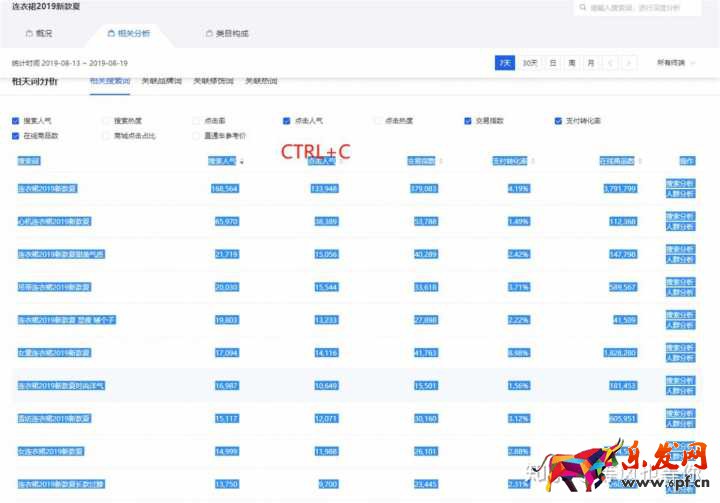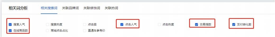 在這個相關分析里面記得一定要選這五項:搜索人氣、點擊人氣、交易指數、支付轉化率、在線商品數。