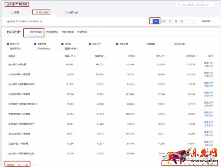 點開“連衣裙2019新款夏”后的“搜索分析”,可以看到“相關分析”,在“相關分析”中與“連衣裙2019新款夏”相關的500個詞(并不是所有的相關詞都有500個,但是很多指數高的詞都有500以上,且數量與版本無關)