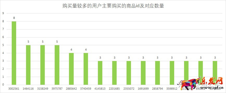 總結(jié):我們需要額外重視ID為3002561的商品類別,雖然該類商品在總計(jì)商品銷量排名中位于第十位,但是該類商品卻是銷量較多用戶購(gòu)買數(shù)量最多的商品,可見該類商品的用戶黏性較強(qiáng),復(fù)購(gòu)率較高。我們還應(yīng)注意4145813、2355072這兩類商品,也為在“商品銷量排名前十”和“較多購(gòu)買用戶購(gòu)買的商品前十”兩表中重復(fù)出現(xiàn)的商品類別。除此以外,如果有關(guān)于用戶的具體信息,還可以進(jìn)一步對(duì)用戶群體進(jìn)行畫像,為下一步精準(zhǔn)推送提供幫助,該處更多用戶信息有待補(bǔ)充。