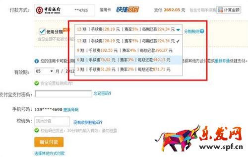 中國銀行淘寶分期付款手續費:3期2%,6期3%,9期4%,12期5%;