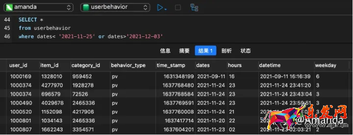 此處,為了方便后文的日期分析,這里用函數 from_unixtime(時間戳,時間格式) 和weekday()兩個時間函數將時間戳轉為不同格式的時間對表格增添,查詢如下: