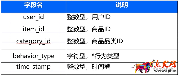 此數據集中已有的字段及behavior_type(行為類型)值域如下: