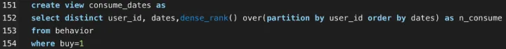 如下語句,通過dense_rank() 窗口函數對對用戶按每次消費時間進行排序,即可得到每個用戶的第n次消費,將字段命名為 n_consume;并用查詢語句新建視圖consume