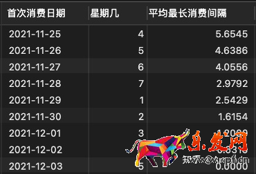 2. 觸達多久:顧客的平均最長觸達間隔為4.4天,在2021年11月25日周四這天,顧客的平均最長消費間隔最長,為5.7天