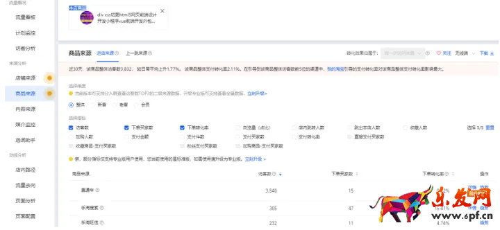 ③分析商品的流量:訪客、轉化;如果從產品的訪客流量上可以看出流量是增長的狀態而轉化不高的話,這個產品慢慢就沒有流量了。商品來源>進店來源>上一跳來源;整體、新客、老客、會員等;