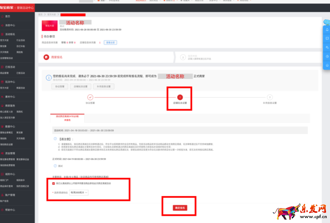 ①跨店滿減玩法報名之后在哪里查看?點擊商家報名-店鋪玩法設(shè)置中查看已經(jīng)設(shè)置好的玩法情況。