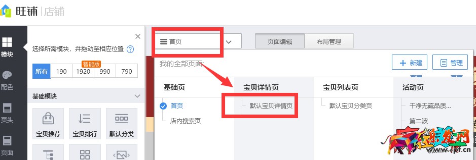 然后,右上角點擊首頁,選擇默認寶貝詳情頁進去