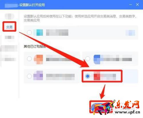 3、在【設(shè)置默認(rèn)】中,點(diǎn)擊【交易】,再選擇需要默認(rèn)的應(yīng)用,再點(diǎn)擊【確定】即可。
