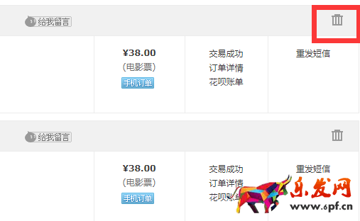 4、之后點(diǎn)擊需要?jiǎng)h除的訂單右上角的“垃圾桶”標(biāo)志,如下圖所示: