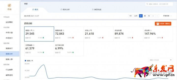 現(xiàn)在打開(kāi)我們的生意參謀后臺(tái),找到我們這邊有一個(gè)市場(chǎng),點(diǎn)擊市場(chǎng)之后呢,下面有一個(gè)搜索分析。然后在這個(gè)搜索框里面搜索一個(gè)詞或者一個(gè)字搜索之后呢