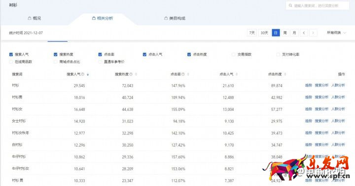 接下來(lái)我們需要用到以下幾個(gè)數(shù)據(jù)啊,比如說(shuō)我們點(diǎn)一下相關(guān)分析,然后點(diǎn)一下我們勾選這里有一個(gè)搜索人氣,有一個(gè)支付轉(zhuǎn)化率,有一個(gè)在線商品數(shù)。那我們要這些數(shù)據(jù)干嘛呢?