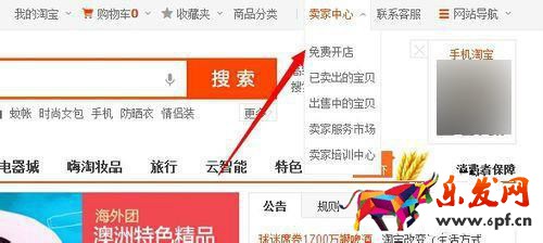1、首先打開淘寶,將鼠標移至賣方中心,然后單擊“免費開店”進入。