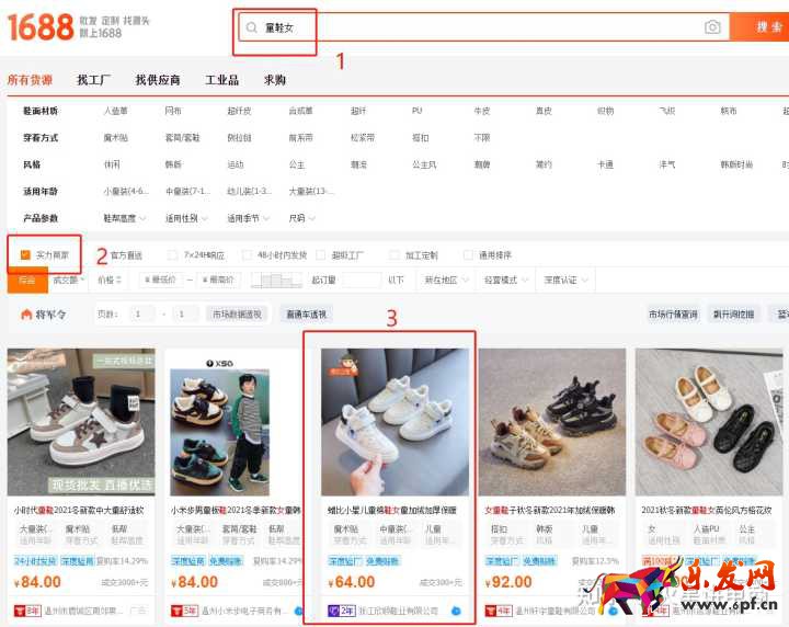 比如你想賣女孩穿的童鞋,你就可以直接在1688搜索“童鞋女”,然后勾選實力商家,再在搜索結果頁選擇你想代銷的款式,如下圖