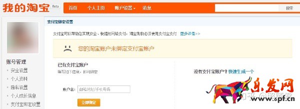 1 登錄淘寶網(http://www.taobao.com),進入【我的淘寶】—【賬戶設置】—【支付寶綁定設置】頁面綁定支付寶賬戶