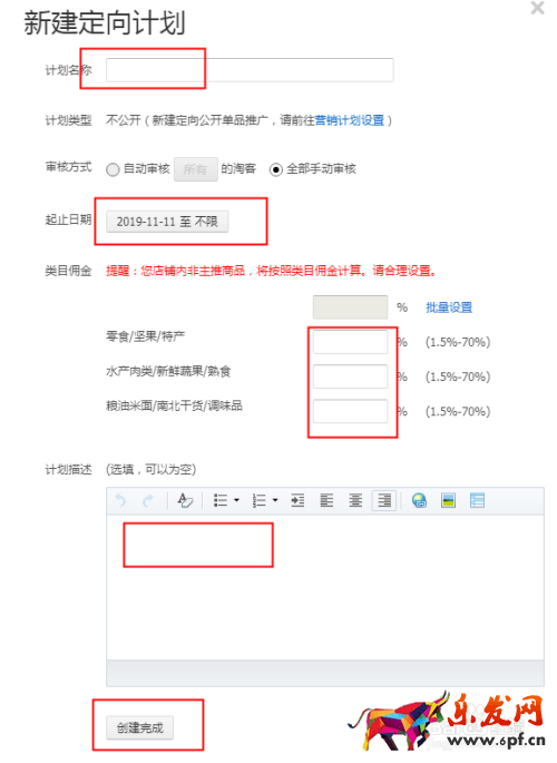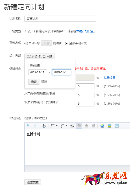 5 填寫計劃名稱,以及傭金,最后點擊創(chuàng)建即可。