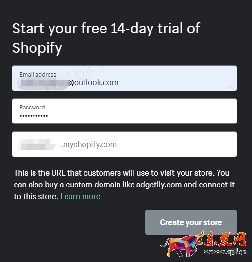 然后,輸入你的電子郵件,密碼和商店名稱(商店名稱可以隨時更改)。