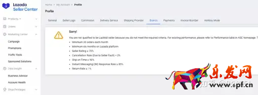 2.如果您點擊“Brand ”出現以下頁面,則表示你的賬戶表現暫時不符合入駐Lazmall.