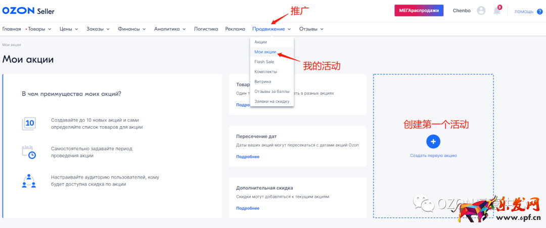 動首先打開我們的OZON賣家平臺,點擊“推廣” — “我的活動”,然后在界面右側點擊“創建第一個活動”。因為谷歌翻譯的問題,“推廣”會翻譯成“晉升”,“我的活動”翻譯成“我的股份”,但是這都不重要,讓我們開始接下來的活動設置。
