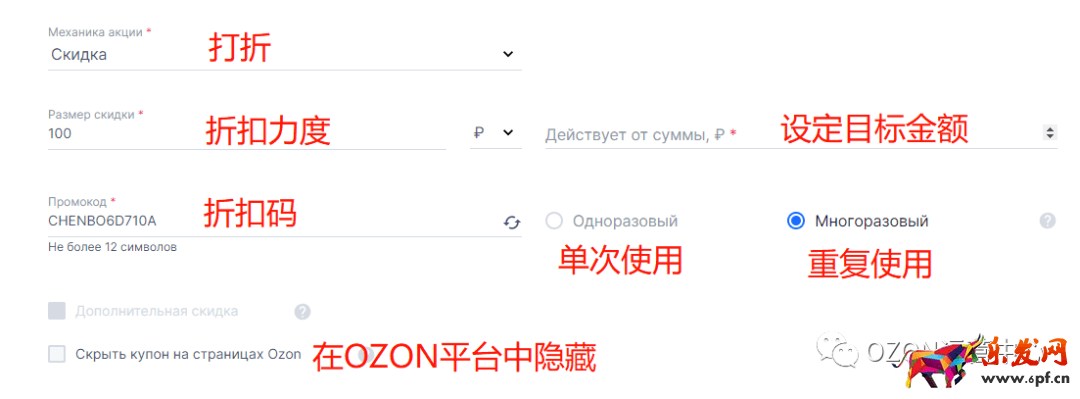 下面可以系統自動生成折扣碼,或者手動輸入(由字母和數字組成,不能超過12個字符)。右側可以選擇折扣碼是單次使用還是多次使用。如果你不想在OZON的頁面中展示你的折扣碼,我們可以選擇隱藏。